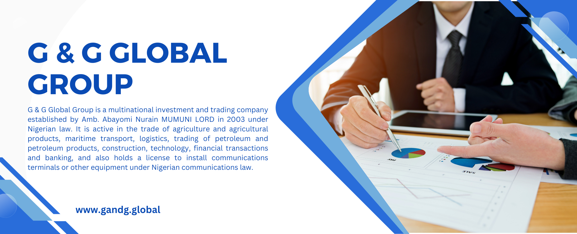 G & G Global Group is a multinational investment and trading company established by Amb. Abayomi Nurain MUMUNI LORD in 2003 under Nigerian law. It is active in the trade of agriculture and agricultural products, maritime transport, logistics, trading of petroleum and petroleum products, construction, technology, financial transactions and banking, and also holds a license to install communications terminals or other equipment under Nigerian communications law.